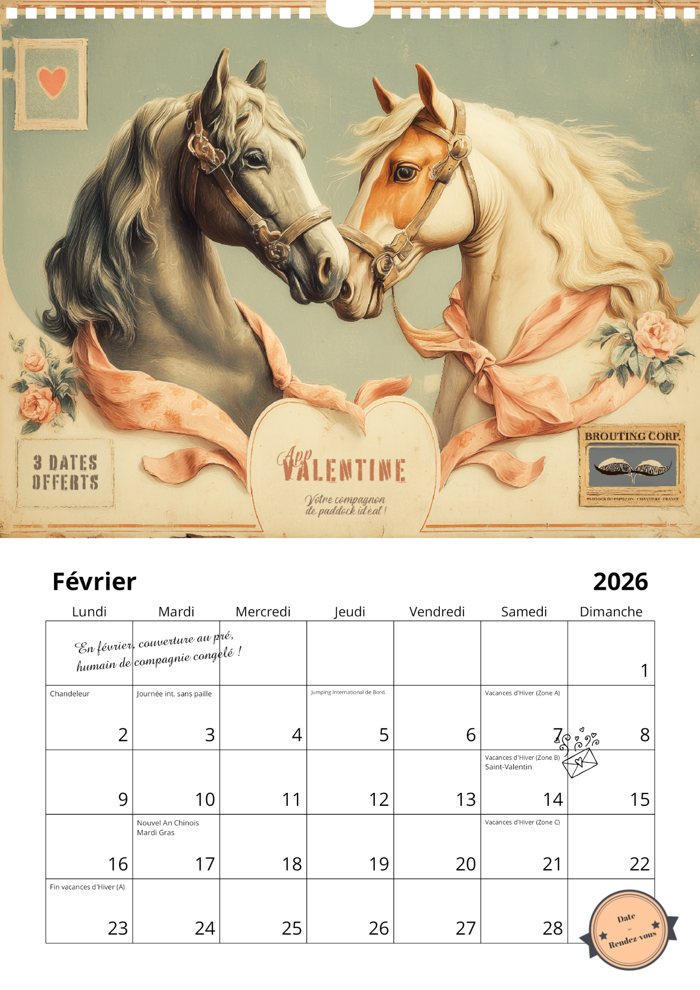 Calendrier mural 2026 pour équidés et leurs humains de compagnie.